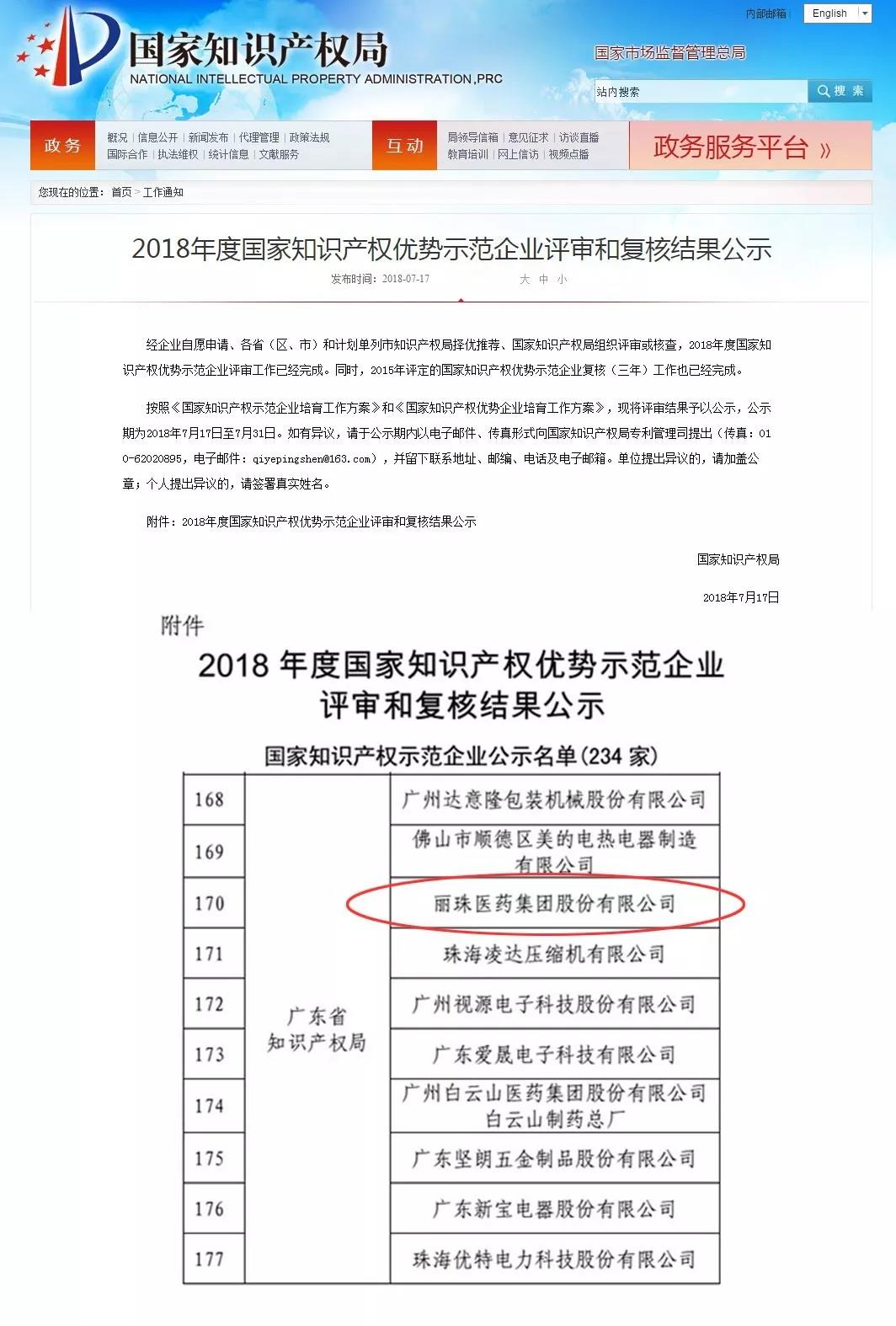 【概要描述】日前,由国家知识产权局组织评审的“2018年度国家知识产权优势示范企业”结果已出炉,丽珠医药集团股份有限公司被认定为“国家知识产权示范企业”。“国家知识产权示范企业”是国家对企业知识产权创造、运用、保护、管理等方面工作突出授予的最高荣誉,是国家给予企业知识产权管理工作的最高评价,能获此殊荣标志着集团知识产权工作再攀新高。